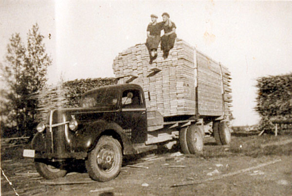 Ford-kuorma-auto ostettiin Ikkeläjärven sahalle 1948. Kuva 1950-luvun alusta. Aaro Haapakoski (vas.) ja Niilo Kanto.