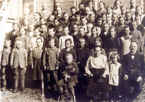 Teevahaisen kansakoulun oppilaita opettajansa Nestor Laitisen kanssa.