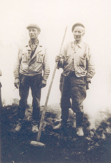 Hanamäen tervahaudalla 1955 Eino Törmä (vas.) ja Eemil Rintamaa.
